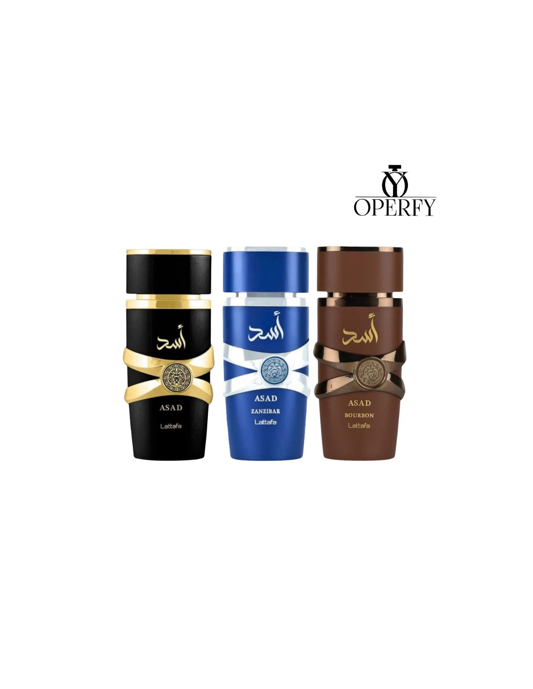 Set de perfumes Lattafa Asad para hombre que incluye Asad, Asad Bourbon y Asad Zanzibar, tres fragancias de estilo oriental y amaderado con excelente fijación y proyección. Asad destaca por sus notas especiadas y avainilladas, Asad Bourbon aporta un carácter cálido, dulce y sofisticado, mientras que Asad Zanzibar ofrece un toque fresco y exótico con matices orientales. Ideal para quienes buscan un perfume intenso, duradero y con gran presencia. Un set versátil y poderoso, perfecto para regalo o para quienes desean variar su fragancia según la ocasión.