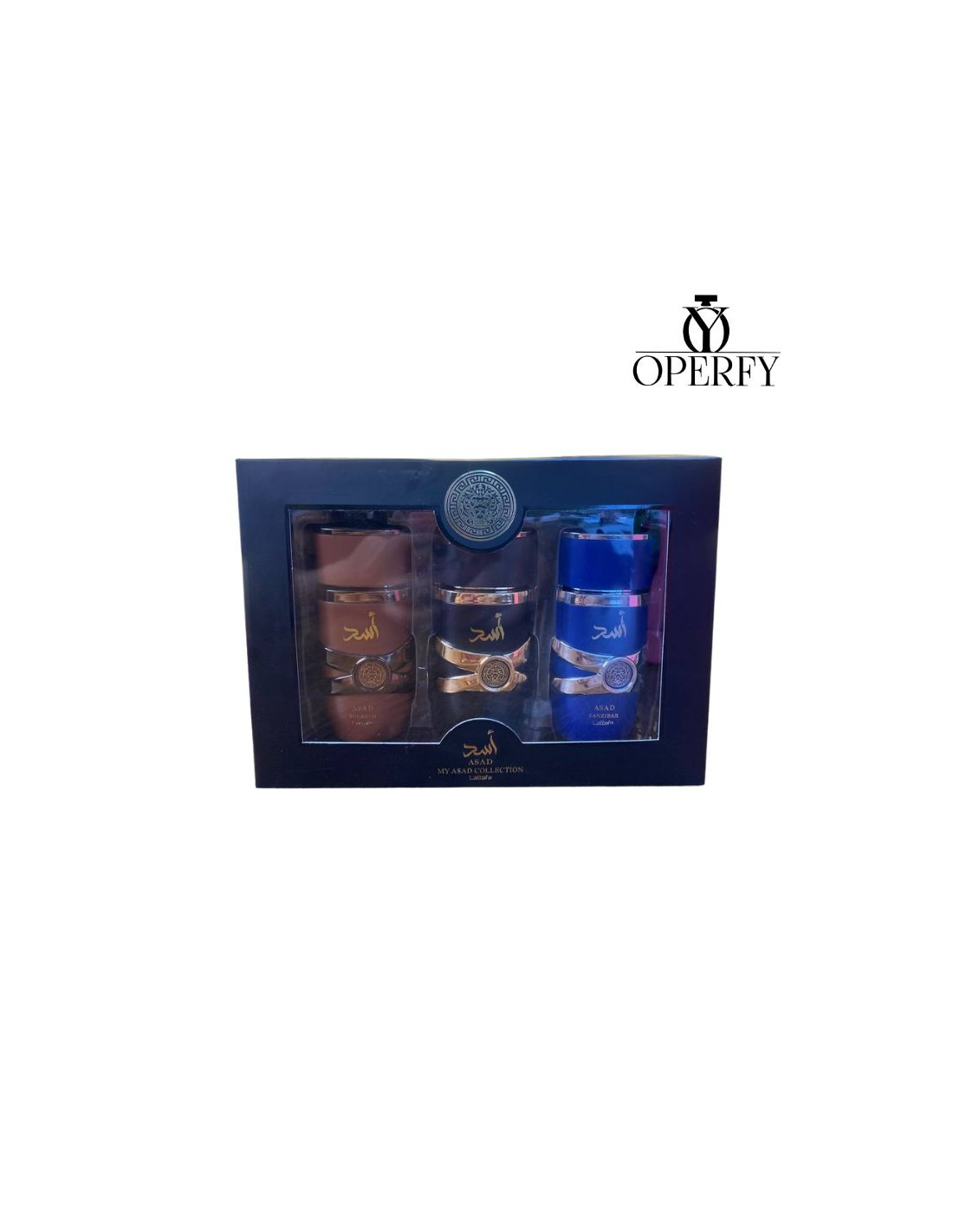 Set de perfumes Lattafa Asad que incluye Asad , Asad Bourbon y Asad Zanzibar, una colección masculina intensa y moderna. Este estuche ofrece una combinación de aromas especiados, dulces, amaderados y orientales, ideal para hombres seguros que buscan potencia, elegancia y versatilidad en una sola presentación. Perfecto para uso diario, noches especiales o como regalo.