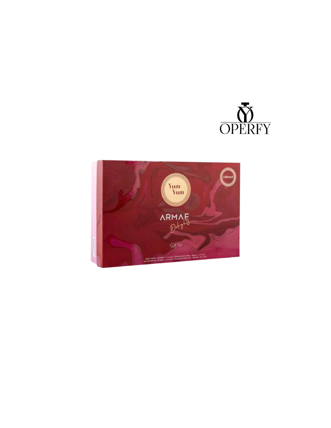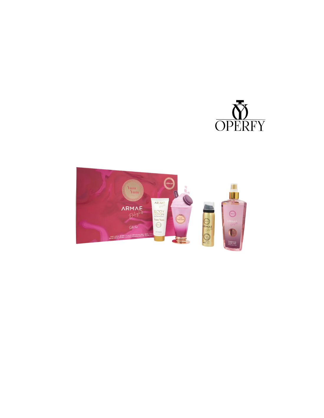 Set Armaf Yum Yum para mujer, un completo kit de fragancia y cuidado corporal que incluye Body Mist 250 ml, Eau de Parfum 100 ml, Loción Corporal 200 ml y Body Butter 165 ml. La fragancia Yum Yum destaca por su aroma dulce, femenino y adictivo, ideal para quienes aman perfumes suaves pero duraderos. La loción y la manteca corporal hidratan profundamente la piel, prolongando el aroma y dejando una sensación sedosa, mientras que el body mist aporta frescura durante el día. Un set perfecto para regalo, rutina diaria de cuidado personal o para quienes buscan una experiencia aromática completa con el sello de calidad Armaf.